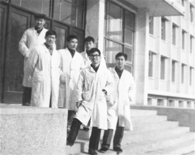 郝伟是1977年的高考生。大学期间,安徽医科大学解剖楼前郝伟(图右二)与同学合影。