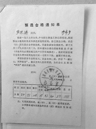 1987年,大儿子罗洪涛高中毕业时,预选制度仍在实施。只有当年招生人数3~5倍的考生能够参加高考,超出部分人数则通过预选考试提前淘汰。因此,罗建植收藏的那份“预选合格通知单”是许多人努力多年也没拿到的通行证。