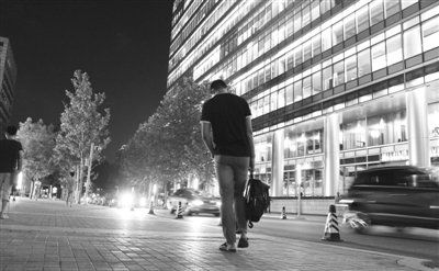 21点30分,刚加完班的员工走出灯火通明的办公大楼。曹玥 摄