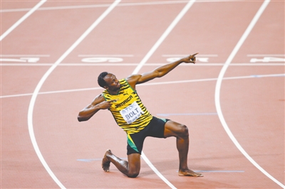 博尔特夺冠后经典的庆祝手势,已成为田径赛场上永恒的风景。 视觉中国 供图