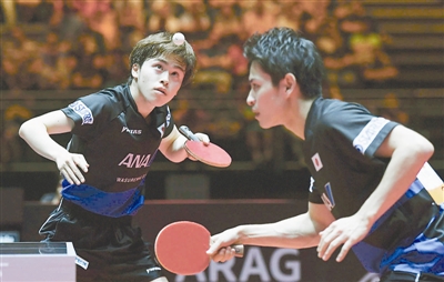 日本乒乓球队近年来进步明显,已成为中国队的最强劲对手。图为夺得2017年世乒赛男双亚军的日本选手森园政崇(左)/大岛祐哉。 新华社记者 陶希夷 摄