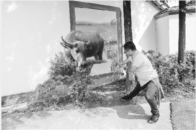 6月8日,一名游客在与一处民居的墙画“互动”。