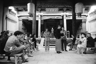 在游客们在陕西西安蓝田县白鹿原影视城体验场景剧《乡约立威》(6月9日摄)。