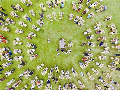 6月4日, 西湖边摆开的100架手工织机上,市民们在体验传统土布织造技艺。东方IC 供图