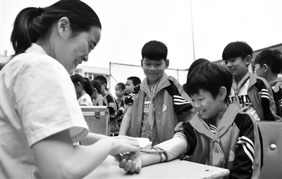 6月12日,在河南省淮阳县留守儿童关爱学校,学生们接受免费义诊。