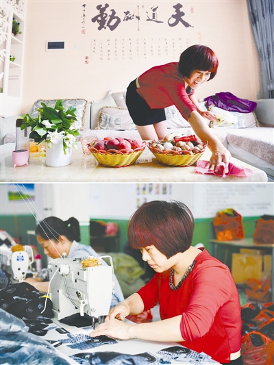 拼版照片:上图为平利县城关镇药妇沟社区居民吴丰珍在搬迁后的新家中整理茶几;下图为吴丰珍在社区一家手套制品公司车间内缝制手套(6月13日摄)。