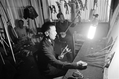 6月13日,甘肃省定西市安定区称钩驿镇平安村皮影艺人鲁希兴(前)在该区文化馆百姓舞台表演皮影戏。6月10日至15日,安定区举行皮影戏展演活动,来自该区的6支皮影戏剧团艺人登台展示技艺,传承非遗文化,丰富群众文化生活。 新华社发(陈永刚 摄)