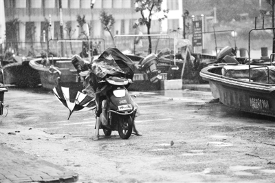 6月13日上午,受台风“苗柏”影响,深圳市气象台将暴雨黄色预警升级为橙色,该市进入暴雨防御状态,暂停户外作业和活动。图为深圳南澳家长顶着风雨送孩子上学。