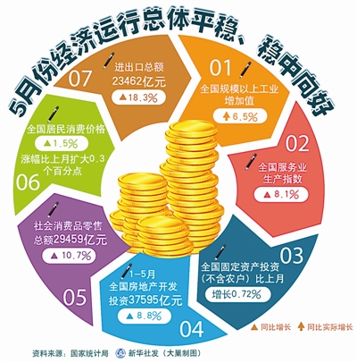 国家统计局14日发布了5月份中国经济主要数据,尽管投资等个别指标出现短期小幅波动,但“总体平稳、稳中向好”仍是经济运行主基调。