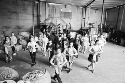 在广州海珠区中山大学布匹市场垃圾压缩站里,有一个简陋的大棚,一群环卫女工常常在这里伴随着音乐翩翩起舞。