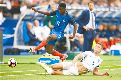 6月13日,法国队球员登贝莱(左)与英格兰队球员卡希尔在比赛中拼抢。