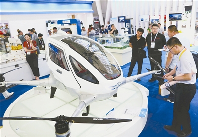 在开幕当天的“中俄合作馆”内,自动驾驶载人飞行器、模拟飞行等高新技术产品集中亮相。图为中国飞行器企业生产的世界首台电动自动驾驶载人飞行器引客商围观。王舒 摄/中新社