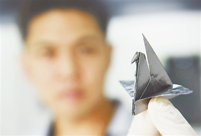 浙江大学高分子科学与工程学系博士生彭蠡在展示用高导热超柔性石墨烯膜折叠而成的“千纸鹤”(6月14日摄)。