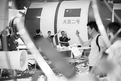在近日举办的第20届中国北京国际科技产业博览会上,以天宫二号、北斗导航系统、智慧城市、人工智能等为代表的众多新兴科技产业成果得到集中展示,吸引了众多科技爱好者前来参观。图为在航天科技展区,参观者争相与天宫二号模型合影留念。