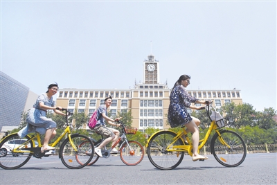 图为6月16日,北京市民骑着共享单车从电报大楼前经过。