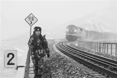 图为武警青海省总队二支队十七中队队长杨富祥带领士兵在铁路上执勤巡逻。(本报资料图片)
