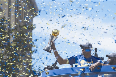 6月15日,金州勇士队在家乡奥克兰举行巡游,庆祝夺得2016-2017赛季NBA总冠军。图为勇士队球员杜兰特在巡游中展示总决赛最有价值球员(MVP)奖杯。新华社/路透