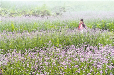 6月17日,人们在湖北省宣恩县锣圈岩景区马鞭草花丛中游玩。