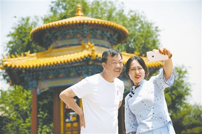 6月18日,在河南省焦作市武陟县嘉应观景区,讲解员刘丹(右)和父亲刘红军在御碑亭前合影留念。当日是“父亲节”,河南武陟嘉应观景区举行“我为父亲当导游”活动。景区职工邀请自己的父亲到景区参观游玩,让老人了解子女的日常工作,增进家庭感情。 新华社发 (冯小敏 摄)