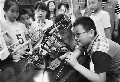6月17日,在山东省聊城市东昌府区湖北社区文化活动中心,外来务工人员子女在观察无人机的构造。山东聊城大学计算机学院“E青志愿者协会”的志愿者定期开展“公益小天使”活动,义务为辖区30多名外来务工人员子女辅导作业。张振祥 摄/中新社