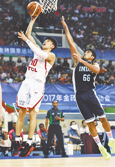 6月18日,在2017年金砖国家运动会男子篮球比赛中,中国队以97比57战胜印度队。新华社记者 毛思倩 摄