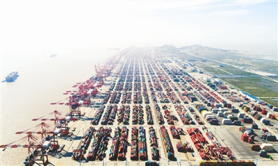 航拍上海洋山港集装箱码头(4月23日摄)。