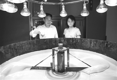袁辉志(左)在车间内向女儿袁端姣叮嘱生漆搅拌过程中的注意事项。