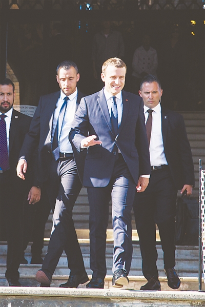 6月18日,在法国勒图凯,法国总统马克龙(前)走出投票站。新华社发