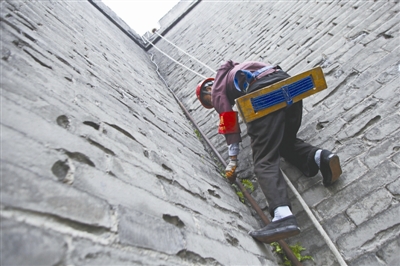 每年从4月到11月,是清理杂草最忙的时候。赵师傅平均每天要在12米高的城墙上爬上爬下20多次,每月需要5到6天才能把周长13.74公里的城墙清理一圈。一年下来,除草人要在城墙上爬上爬下近千次,绕城墙20多圈,每圈都要对城墙内侧和外侧,以及城楼等建筑屋顶进行清理。