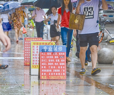 6月19日,广东省深圳市,匆匆忙忙的人们从摆在路边的装修广告牌边走过。