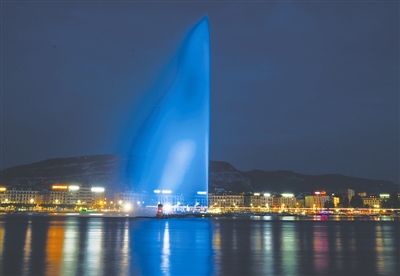 日内瓦大喷泉点亮“蓝灯”纪念世界难民日