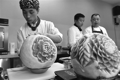 6月22日,“希望厨师”在毕业典礼上展示在西瓜上雕花技艺。