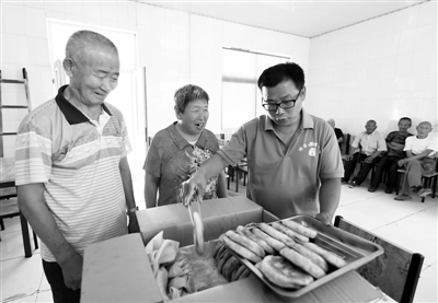 6月20日,山东省邹平县九户镇“党员暖心一条街”的闫士友(右一)为老党员提供免费爱心餐。当日,九户镇启动以温暖老党员和贫困党员为主题的“党员暖心行动”,开辟了“党员暖心一条街”,由全镇的10个党支部和20多家爱心店铺为700余名老党员和贫困党员发放暖心行动服务卡,为其生活提供长期的免费或便利服务。 董乃德 摄/东方IC