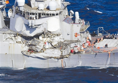 6月17日凌晨,美国海军宙斯盾驱逐舰“菲茨杰拉德”号与菲律宾集装箱商船“ACX 水晶”号在日本静冈县南伊豆町近海相撞。撞船事故导致“菲茨杰拉德”号舰长等3人受伤,7名船员死亡,军舰舰体右侧大幅损坏。该舰所属美国海军第七舰队司令奥库安说,“菲茨杰拉德”号在撞击后差点儿沉没,“损坏非常严重,水下有一道大裂缝”;而与“内伤”严重的军舰相比,此番相撞却只给“ACX 水晶”号商船造成了一点“皮外伤”——商船仅船头受损,20名船员无一受伤。
