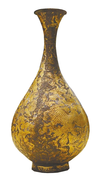 何刚捐赠的19件文物中,银镀金錾花双凤穿花玉壶春瓶尤为珍贵(如图)。视觉中国供图