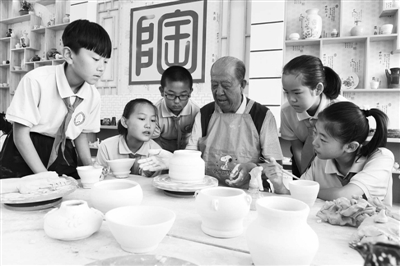 6月26日,呼和浩特市,清水河瓷艺传承人张选(右三)为学生们传授清水河瓷艺。