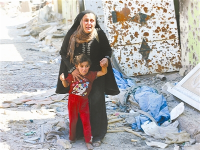 6月25日,一名伊拉克妇女带着孩子从摩苏尔老城撤离。