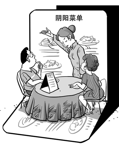 据《成都商报》报道,四川成都一家餐厅使用“阴阳菜单”,很多菜在包间内消费都比大厅贵,少则10元,多则几十元,而餐厅内没有关于同菜不同价的任何提示。该餐厅负责人解释称,包厢里的菜量普遍要大一些,而且包厢是不翻台的,加上房租贵,所以菜价和大厅不一样。目前执法部门已要求该餐厅接受调查。