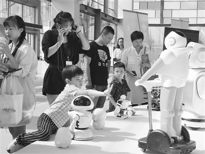 在近日2017“创响中国”大连站活动举办期间,一批双创成果展吸引了众多观众驻足观看。在大连毛毛虫科技有限公司的展台,一款儿童陪伴教育机器人不仅外观出众,而且具有智能对话、智能安防等功能,在闻声识人的同时给出相应的场景反馈,让在场的儿童和家长兴奋不已。图为小朋友与机器人进行互动。