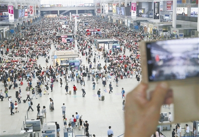 2017年全国铁路暑运从7月1日起至8月31日止,为期62天。图为 6月30日,一名旅客在拍摄上海虹桥火车站候车大厅。新华社记者 陈飞 摄