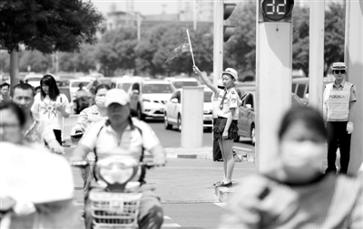 6月28日,“小交警”在民警的指导下上岗体验指挥交通。