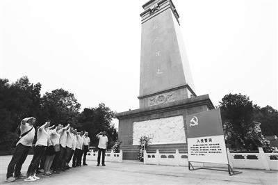 “七一”前夕,在安徽省金寨县烈士纪念塔前,中铁电气化局商合杭铁路站前三标项目部的党员面对鲜红的党旗,重温入党誓词,接受党性洗礼。