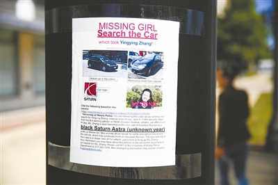 这是7月1日在美国伊利诺伊州中国访问学者章莹颖失踪地附近拍摄的寻人海报。