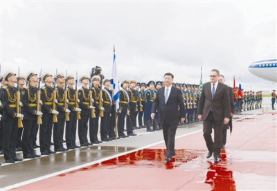 习近平出席机场欢迎仪式。军乐队奏中俄两国国歌。习近平检阅仪仗队,观看分列式。