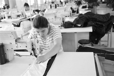 6月30日,在位于安新县安新镇大张庄村的雪瑞莎羽绒制品股份有限公司,员工张妹在加工羽绒服。