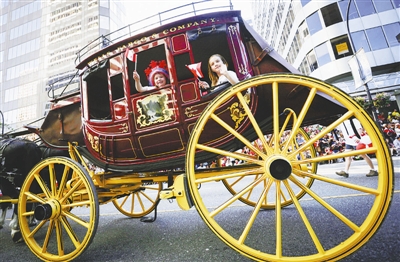 7月2日,在加拿大温哥华,参加巡游活动的儿童坐在马车上挥手。