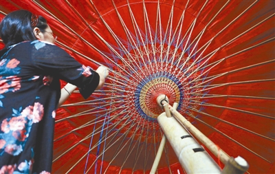 7月2日,四川省泸州市江阳区分水岭镇的许多作坊一派忙碌。近年来,作为国家级非物质文化遗产,油纸伞采用原始的石彩印花印刷方法,全手工生产,走俏市场,产品远销英国、日本等国家和地区,年产油纸伞130万顶,年产值达1200万元。刘学懿 摄/中新社