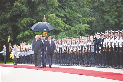 会见前,施泰因迈尔在总统府花园为习近平举行隆重欢迎仪式。