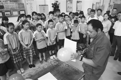7月5日,在航天西安发动机厂车间,“三秦工匠”杨峰为孩子们表演在气球上给A4纸打孔的绝活。