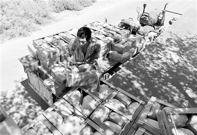 7月3日,在哈密市伊州区南湖乡托布塔村二队,来自四川广元的李天乒往长途运输车上搬运已装箱的哈密瓜。